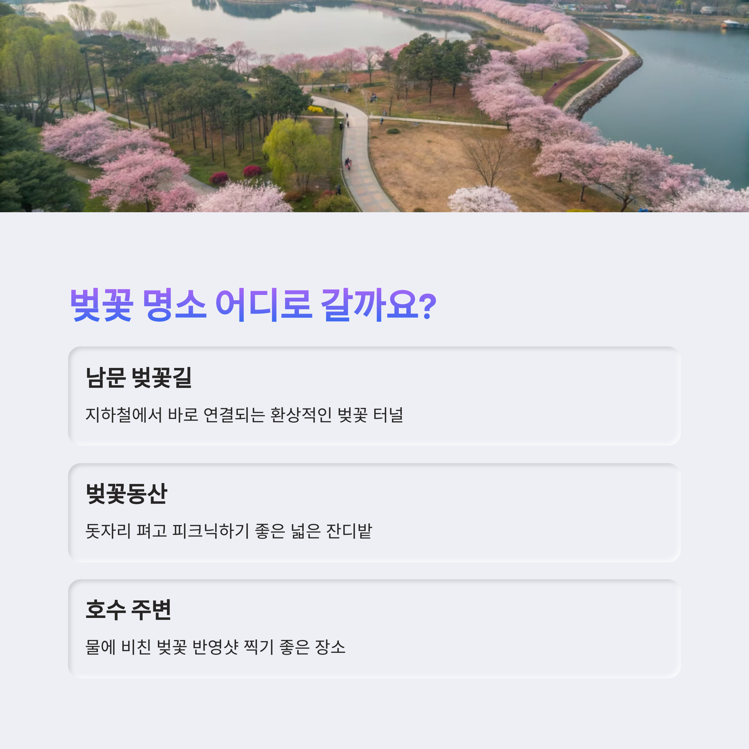 *남문 벚꽃길: 지하철역과 바로 연결되어 접근성이 뛰어나며, 벚꽃 터널을 이루는 아름다운 길입니다. 봄비가 내리는 날에는 더욱 운치 있는 풍경을 감상할 수 있습니다.