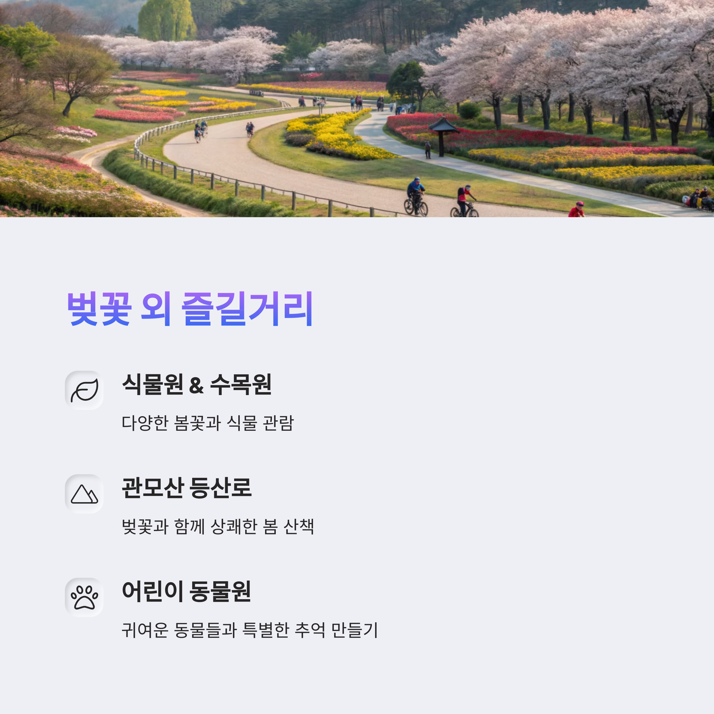 * 어린이 동물원: 귀여운 동물들과 함께 벚꽃을 감상할 수 있는 특별한 공간입니다. 아이들과 함께 즐거운 시간을 보내세요.