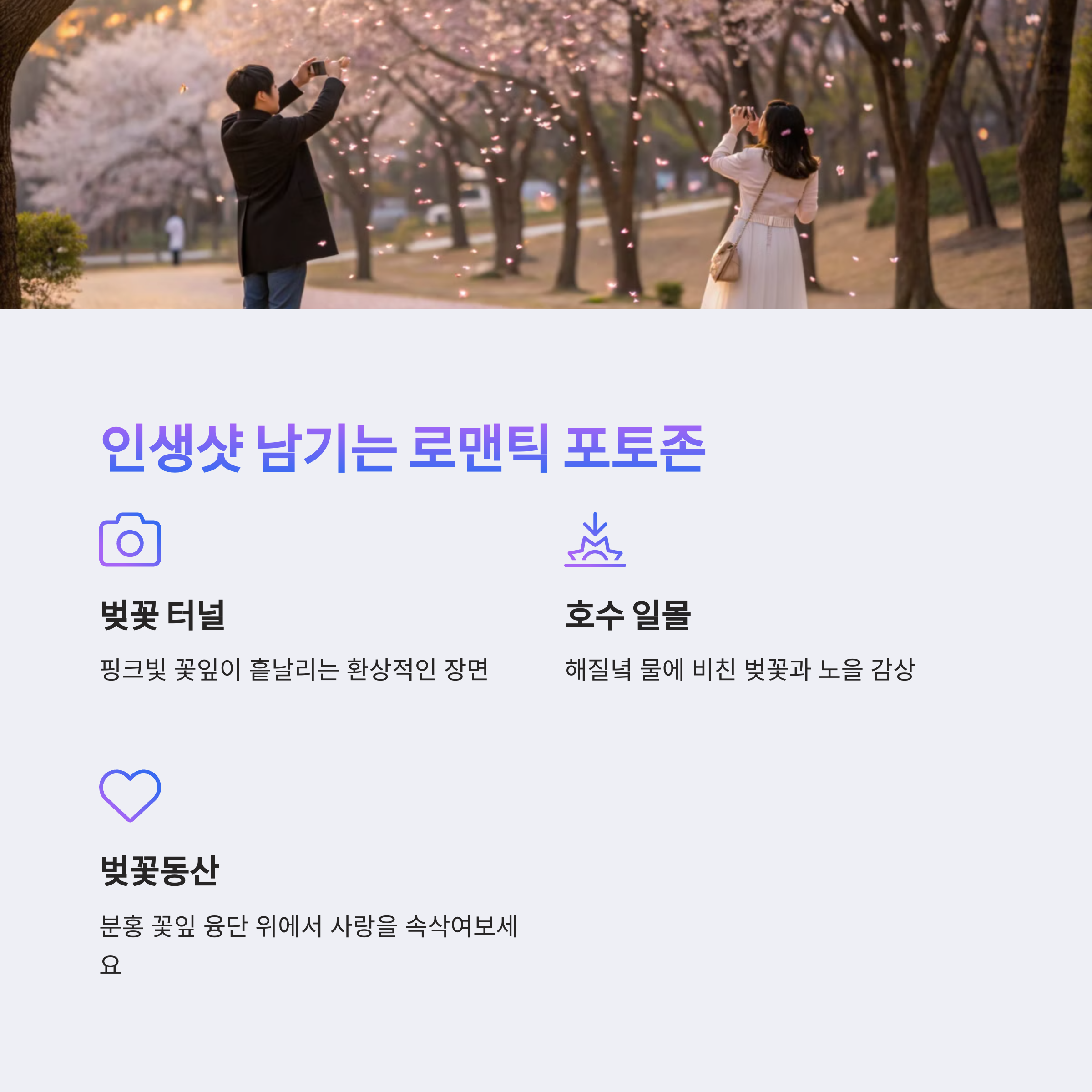 *인생샷 남기기: 벚꽃 터널, 호수 주변 등 예쁜 포토존에서 인생샷을 남겨보세요.